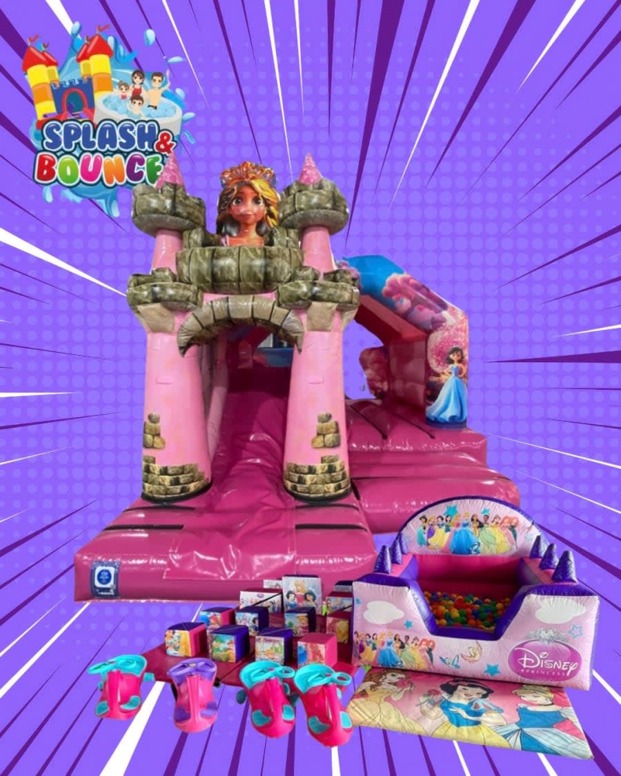 🏰 Princess Combo Castle (13x16ft) – bright, glossy colours with enchanting princess artwork.