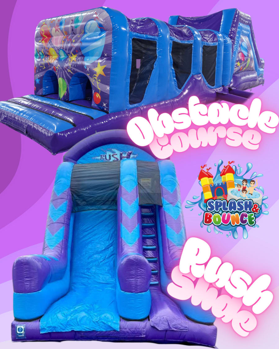 Climb, race, and slide into adventure with our Rush Slide & Blue/Purple Obstacle Course Package – excitement for everyone! 🏃♂️💜💙