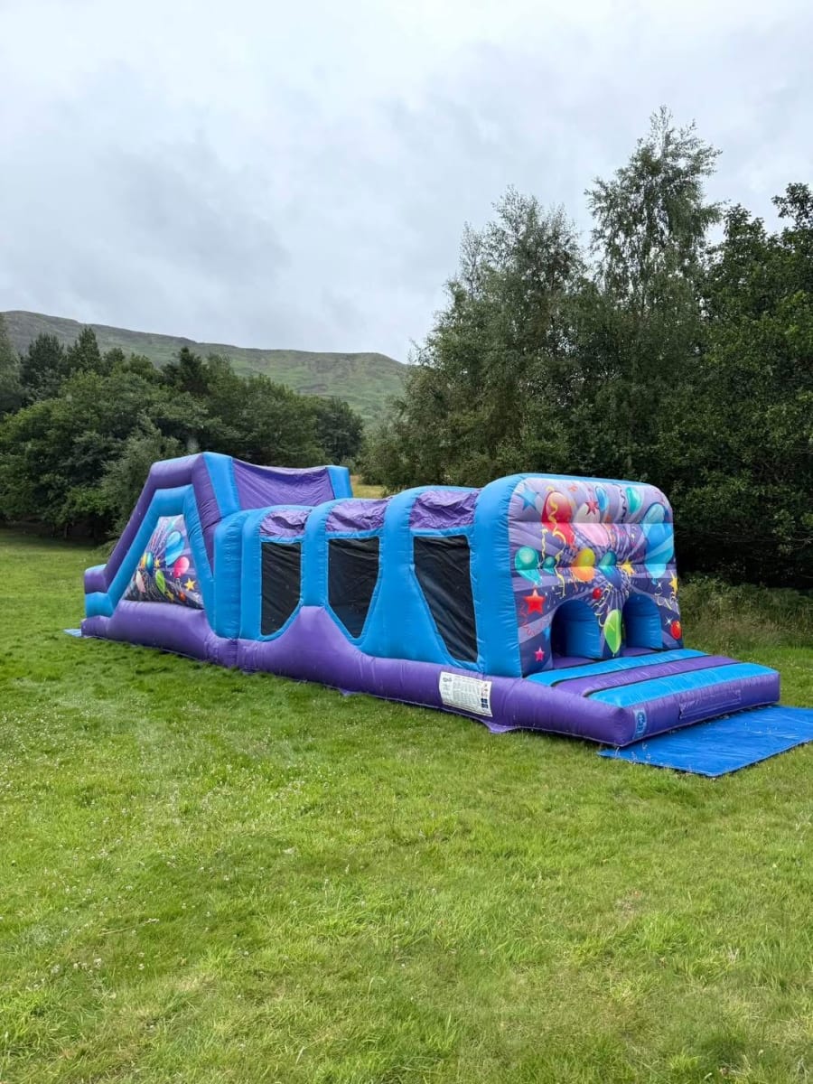 💜💙 40ft Blue & Purple Obstacle Course – challenge friends through tunnels, climbing zones, and biff bashes