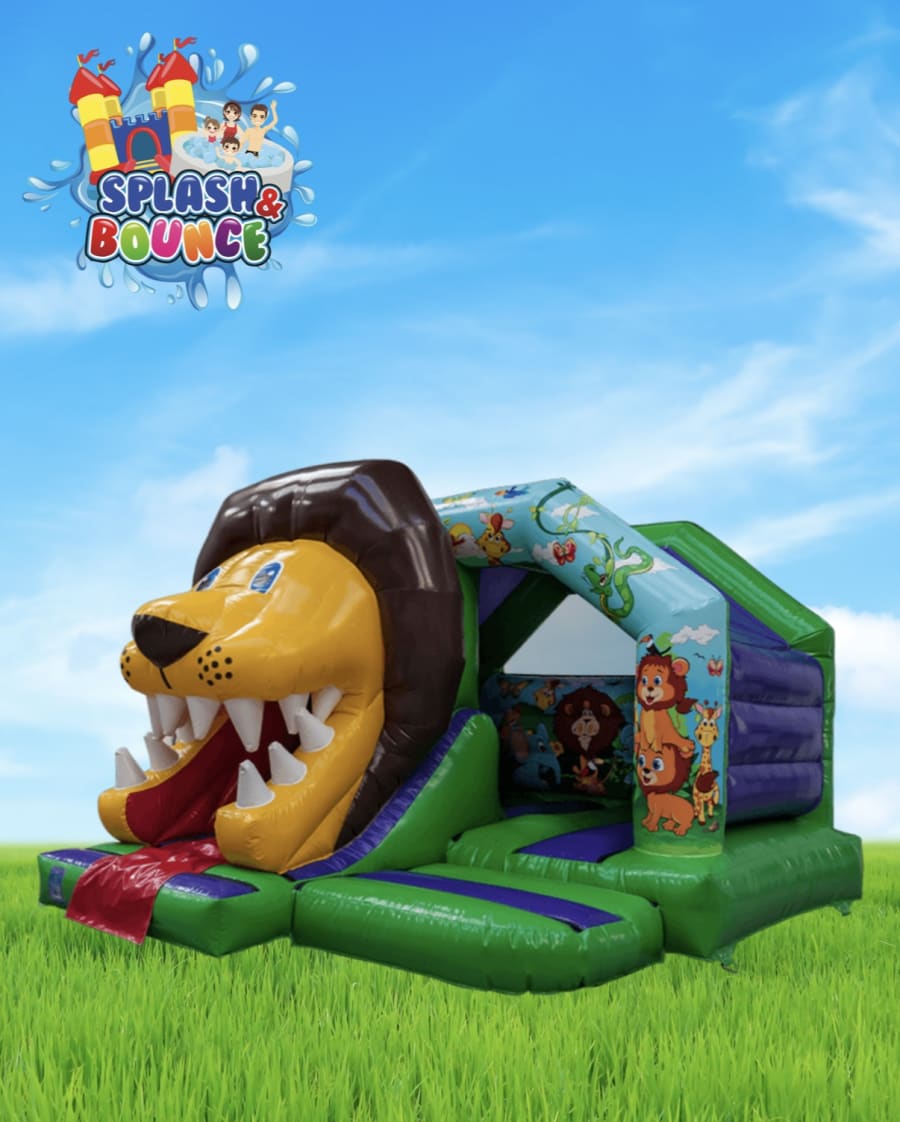 Bring the wild side to your next party with our Jungle Combo Bouncy Castle! Featuring a huge 3D lion head slide that kids can whizz down straight from the bouncy area, this inflatable is bursting with fun and adventure! Bright jungle artwork and playful design make it a firm favourite for any celebration! 🌴