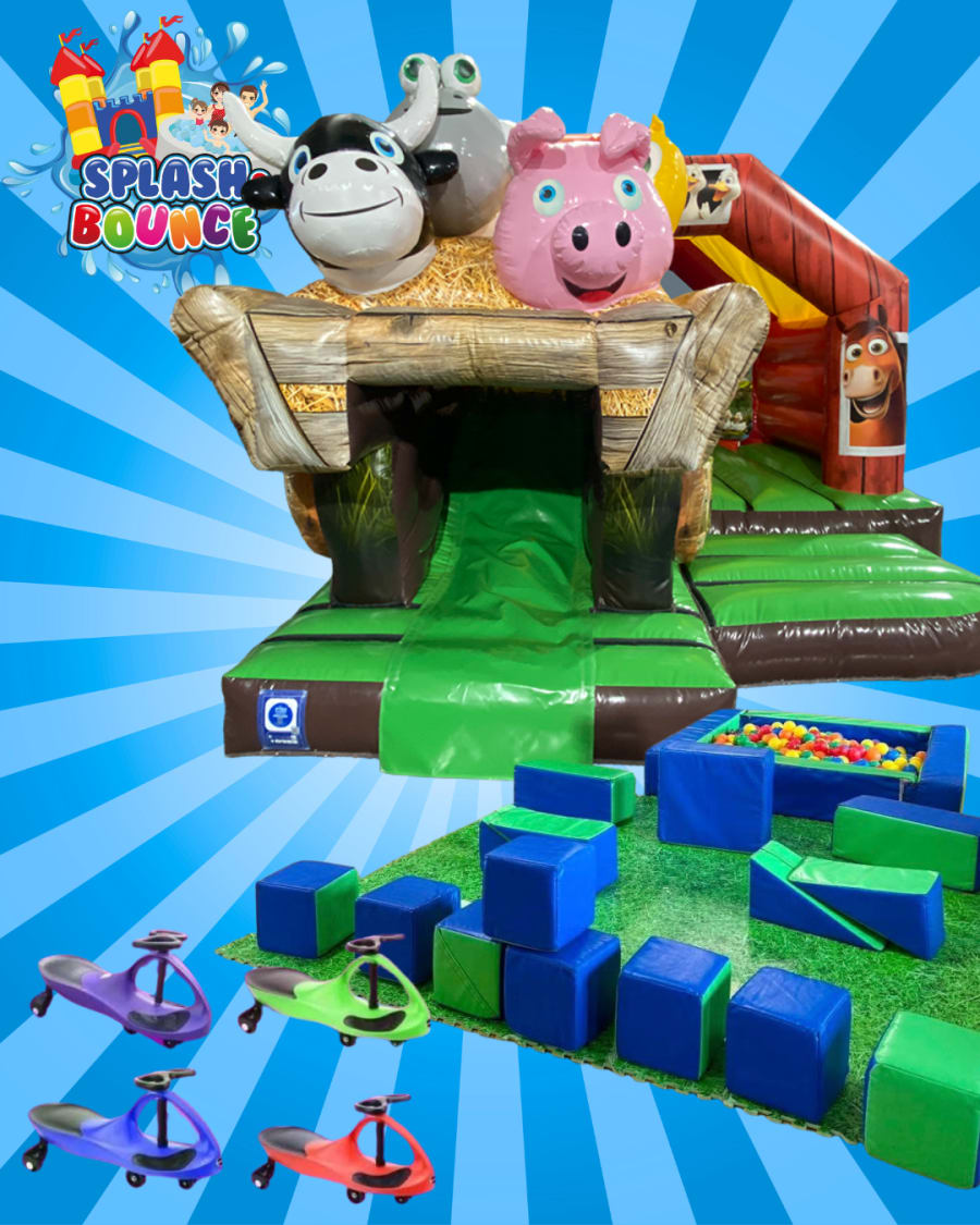 Get ready for a day full of laughter and adventure with our 15x12ft Farm Yard Combo Bouncy Castle with Slide, green & blue soft play, and 4 colourful Diddi Cars! This cheerful farm-themed package is packed with excitement, perfect for children to jump, play, and explore.